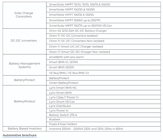 Victron products include sinewave inverters, sinewave inverters/chargers, battery chargers, DC/DC converters, transfer switches, battery monitors and more.
